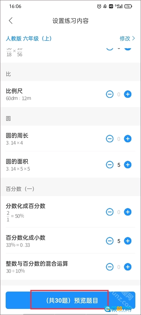 现在开始设置练习内容啦。由于小编准备的是人教版六年级上册的数学内容,所以所有题目都围绕这个年级的知识点展开。大家可以点击右侧的“+”号来添加题目,添加完成后,再点击下方对应的按钮就可以了。
