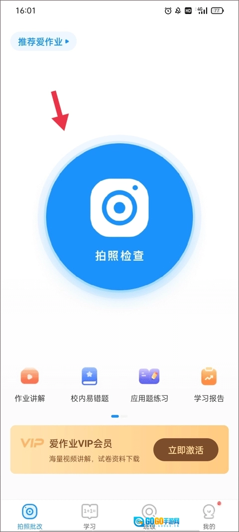 打开软件进入主界面的【拍照批改】板块后,顶部排列着作业讲解、校内易错题、应用题练习、学习报告等多项功能,接下来点击上方的拍照检查按钮即可。
