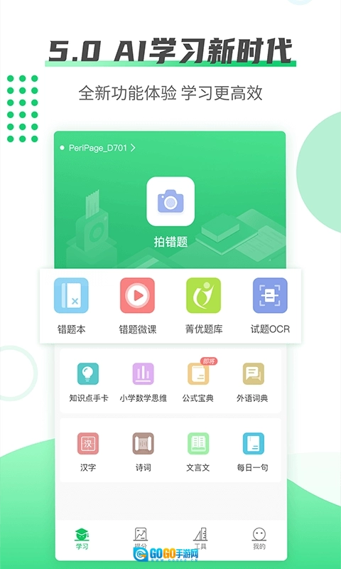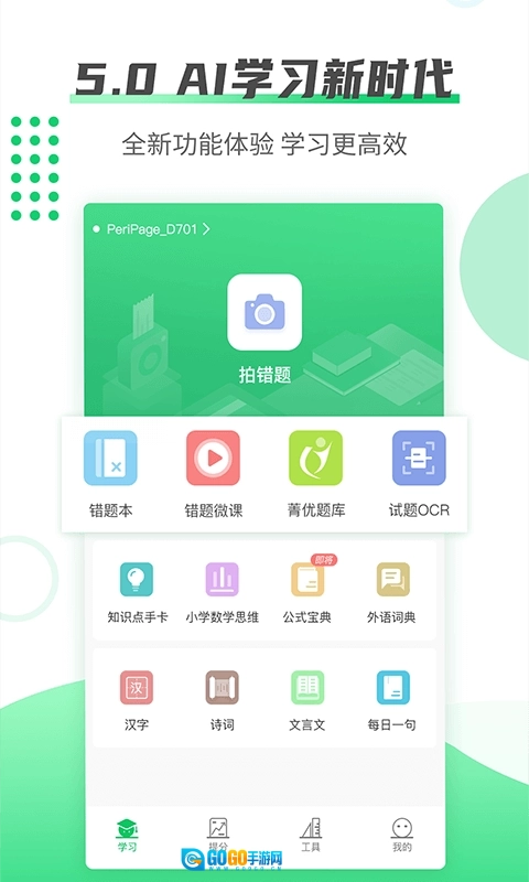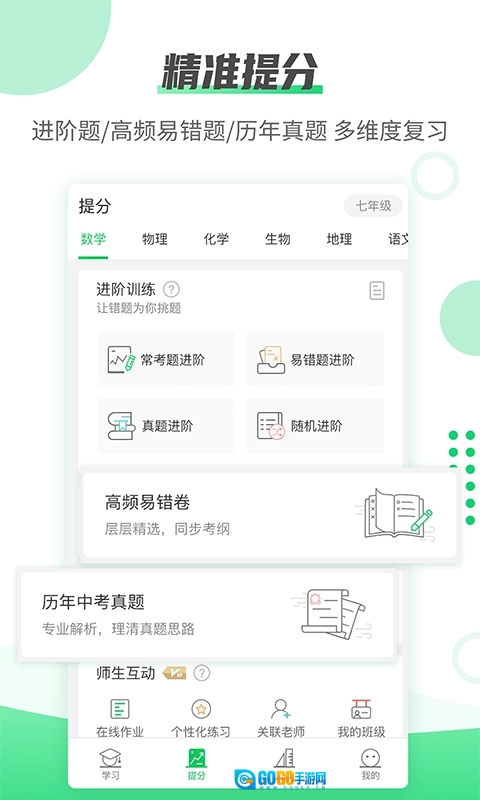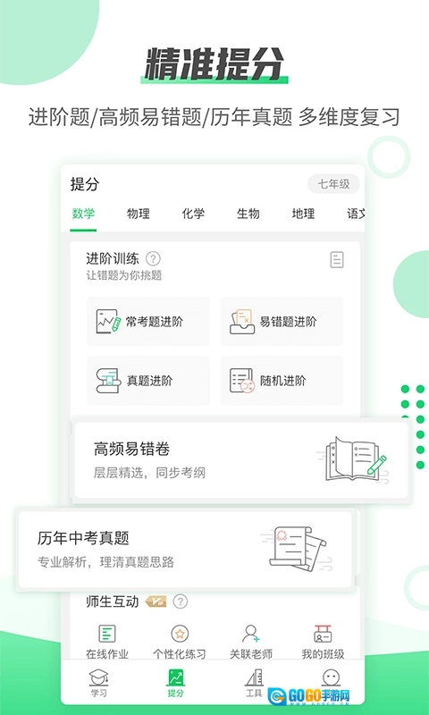 学生端具备智能识题、精准匹配、举一反三、提分训练、错题报告、试卷、学情分析等功能,还能关联教师。