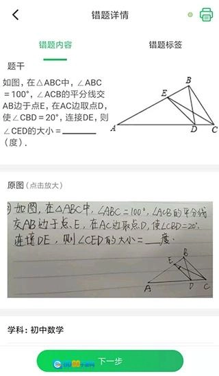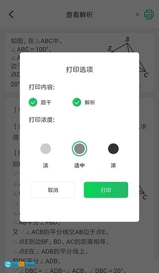 点击页面右上角的打印机图标,在弹出的选项中选择需要打印的内容(如题干、解析)以及打印浓度,确认设置后执行打印操作。您可以根据需求选择是否打印错题解析;若计划重做该题目,建议暂不打印解析,通过手写方式完成解题过程,这样更有助于巩固知识。