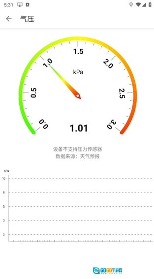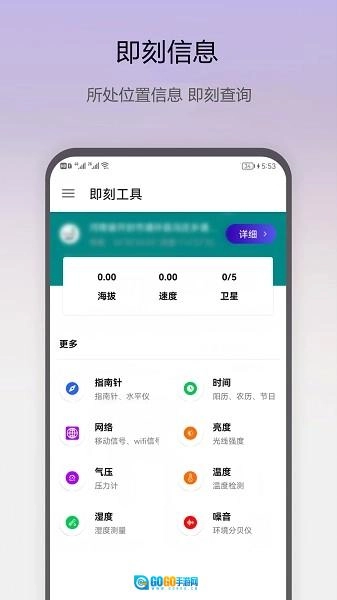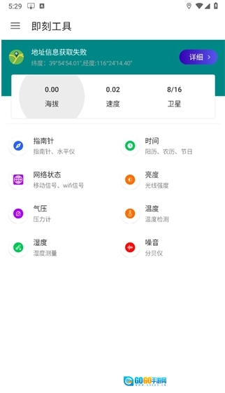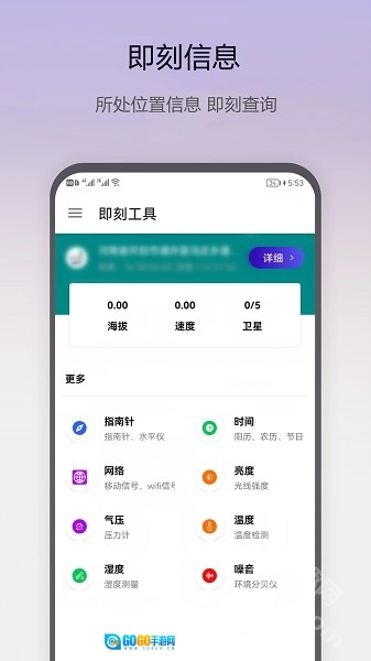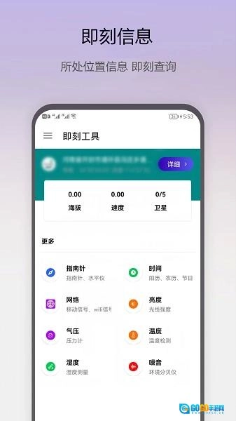 首先前往魔趣网下载并安装即刻工具,打开进入首页后,就能查看指南针、时间、网络状态、亮度、气压、温度、湿度以及噪音等信息。