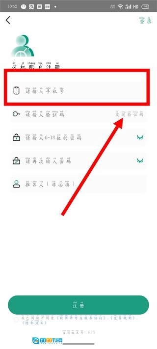 在注册页面,输入手机号后,点击发送验证码。