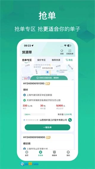 UI设计简洁直观,支持线路收藏与一键抢单功能;系统对接高德、百度导航,接单后能直接跳转导航界面;在线沟通系统,可通过文字或语音交流,便于协商运费及货物细节。