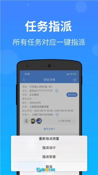 答:首页展示的项目为“我的代办任务”,从名称就能明白,这里呈现的都是需要我去完成的任务,像待我指派、待我测量、待我安装这类;要是别人创建项目后再把你加入某个项目,首页是不会显示该项目的,因为被添加进项目仅意味着你是项目参与人员,并非具体的执行人。