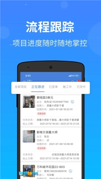 项目流程管理:所有项目流程在待指派、待测量、待安装、待验收、已验收、已关闭这些环节中均可进行查看与编辑操作。