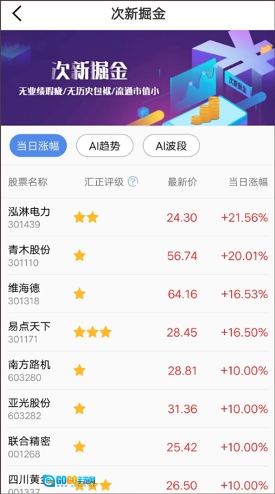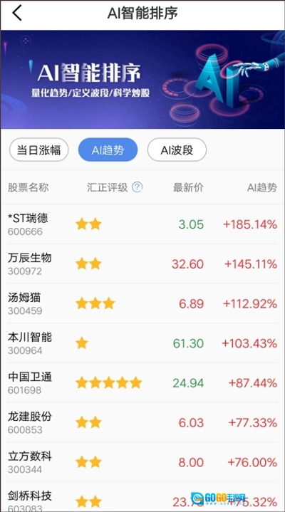分为AI趋势与AI波段两种类型,借助算法识别个股的前期高点和前期低点,并以此为依据来计算个股的趋势走向与波段特征。AI趋势排名前100的股票均属于走势极强的个股,通过智能排序功能,能够协助投资者理清市场中的龙头股情况,进而开展复盘分析。