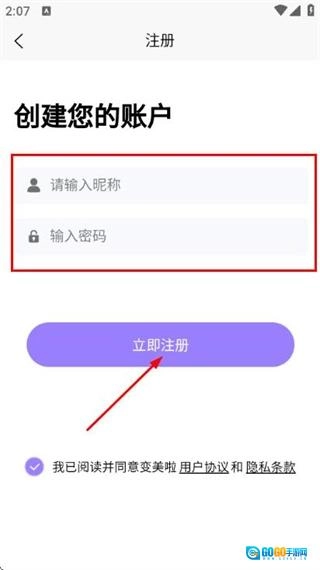在注册页面填写昵称与密码,点击“立即注册”按钮,即可完成注册流程。
