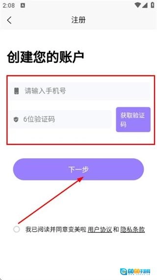 在注册界面输入手机号和验证码,点击下一步。