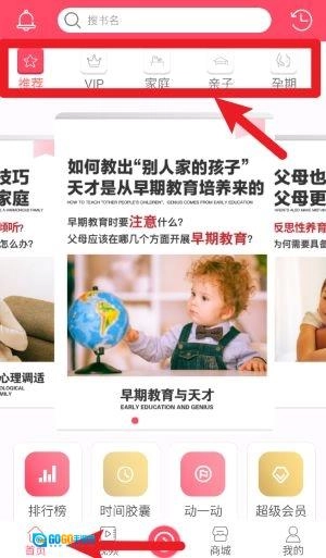 首页顶部设有推荐、VIP、家庭、亲子等分类导航栏,便于用户根据自身需求挑选阅读内容。