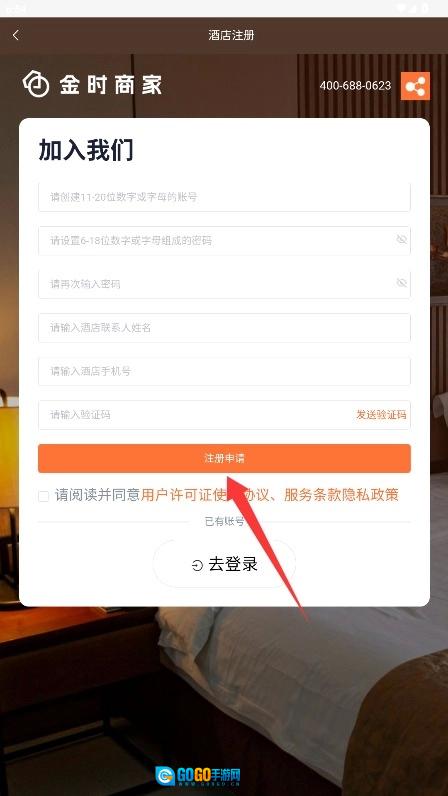 进行酒店注册时,需先创建账号与密码,接着填写酒店联系人的姓名及手机号码,输入验证码后,点击注册申请按钮即可。