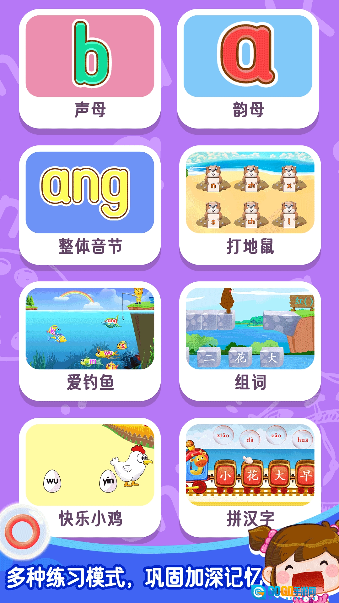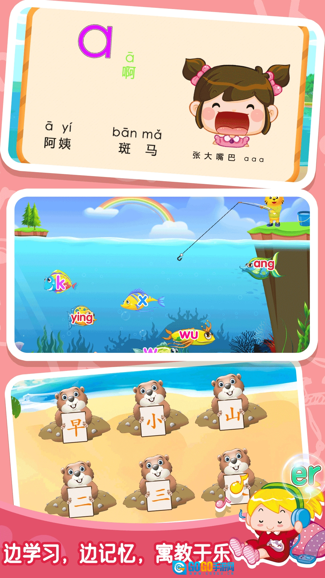 设计了拼音钓鱼、快乐捕鱼等16种拼音游戏,把学习和益智游戏融合起来,让孩子在玩游戏的过程中巩固拼音知识。