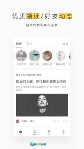 想一头扎进书的世界,却愁没有合适的地方?网易蜗牛读书为你解忧!这里不仅完全免费,书籍质量更是没话说,让你尽情享受阅读的乐趣。书库内容丰富多样,从古代经典名著到当下网络热门作品应有尽有;既能深入探索心理学的奥秘,也能了解电影背后的故事,就连漫画爱好者也能找到自己的心头好。最棒的是,它让阅读不再是一个人的孤单旅程,你可以和朋友组队读书,边读边交流心得,彼此的关系也会越来越亲密。热爱读书的你,赶紧加入进来,和志同道合的书友一起在知识的海洋里畅游吧!
