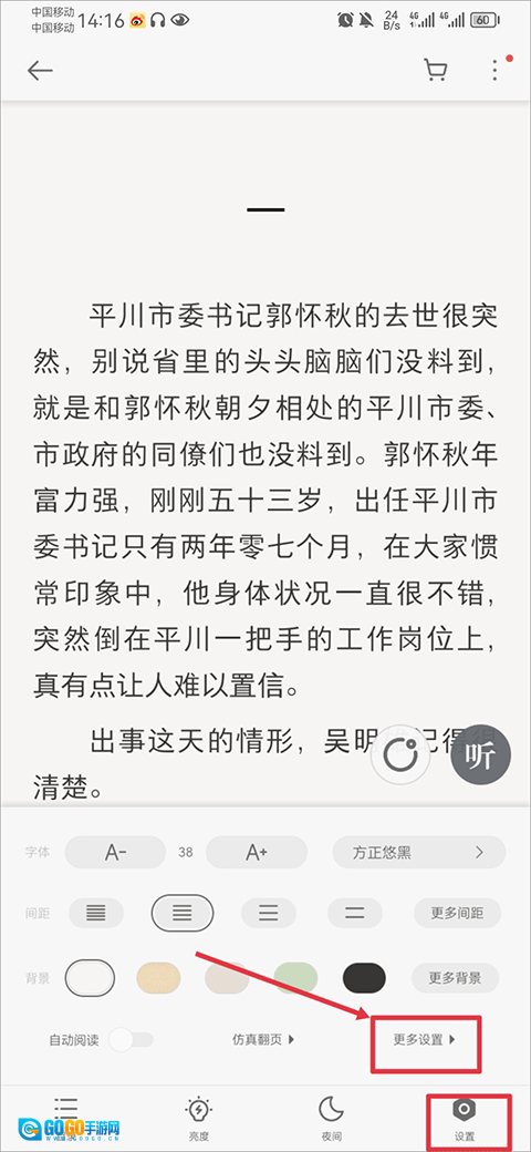 同样在书籍阅读界面,点击屏幕即可调出功能菜单,接着在右下角的设置按钮里选择更多设置选项。