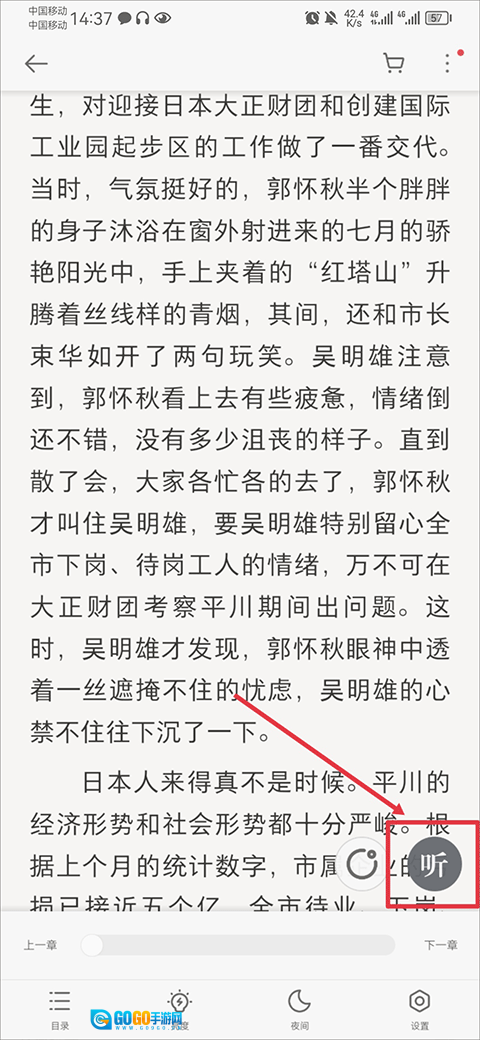 在书籍阅读界面,轻点屏幕即可调出功能菜单,随后点击右下角的听字按钮。
