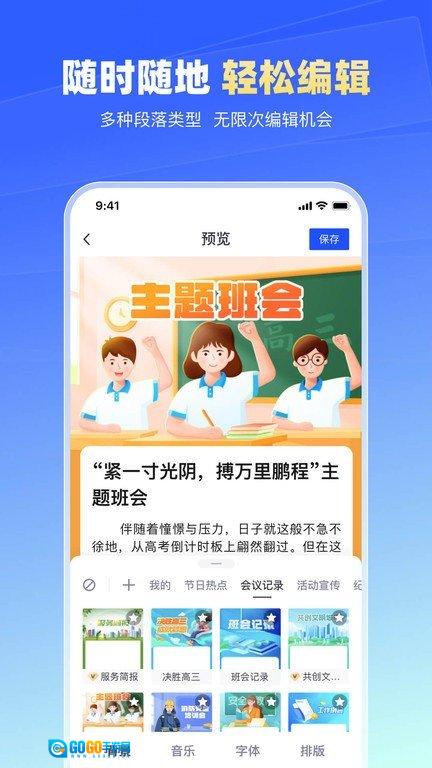 在预览界面,你能够对海报的背景、音乐、字体和排版进行修改。修改完毕后,点击【保存】按钮即可。