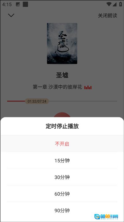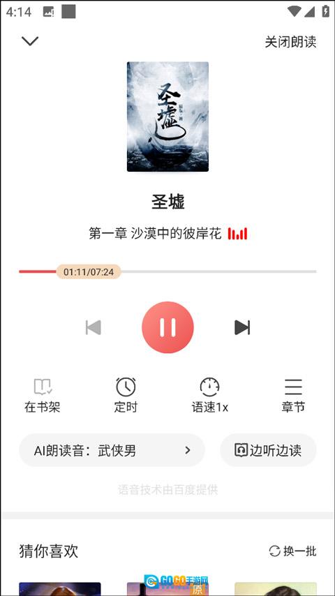 进入听书界面后,你可以使用定时、调节语速、选择章节、切换朗读音色以及开启边听边读等功能。