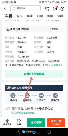 在车辆详情页,可先查看基础信息,再下拉找到【查看更多参数配置】以获取完整参数。