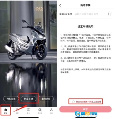 填写车架号→阅读绑定车辆说明并在下方勾选→点击【绑定】按钮