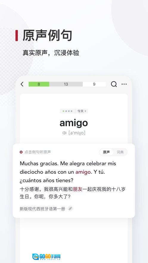收录《每日西语听力》中的海量原声例句,内容出自你喜欢的电影、剧集,或是Telediario、Radio ONU、Practica Espaol等专业新闻,助你了解单词的真实单词语境,专业高效地记忆单词。