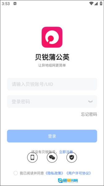 进入贝锐蒲公英软件后,我们需要登录才能使用,该软件支持多渠道登录方式。