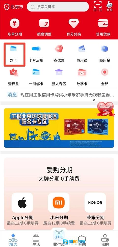 打开软件首页后,可通过“精选”或“金融”页面找到办卡的入口。