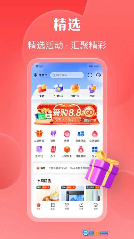 这款软件的功能十分丰富,主页设有精选、生活、积分、好物和我的功能模块。其中,好物页面整合了线上线下消费场景,比如品牌商品可搭配在线分期服务,既方便使用分期功能,还能享受免息优惠;生活页面汇集了大量优惠活动及入口;积分页面融入了游戏、集市等互动玩法,覆盖美食、运动、汽车等各类生活服务场景与项目。