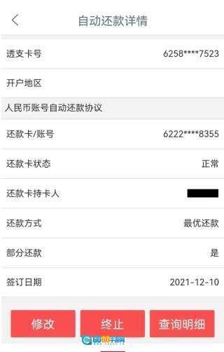 若您的卡片已开通自动还款功能,点击该卡片进入详情页面后,即可查看还款协议的具体内容,还能对自动还款协议进行修改或终止操作,同时也可查看自动还款的明细记录。