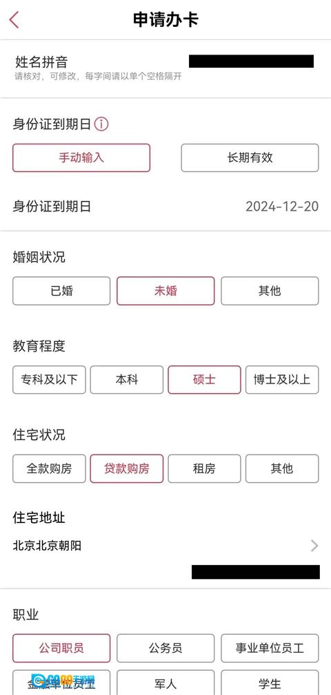 若您最近未曾办理过我行的信用卡,就需填写身份证到期日期、婚姻状况、教育水平、住房情况、职业相关信息、税前薪资、联系人信息以及邮寄地址等内容,然后提交申请。