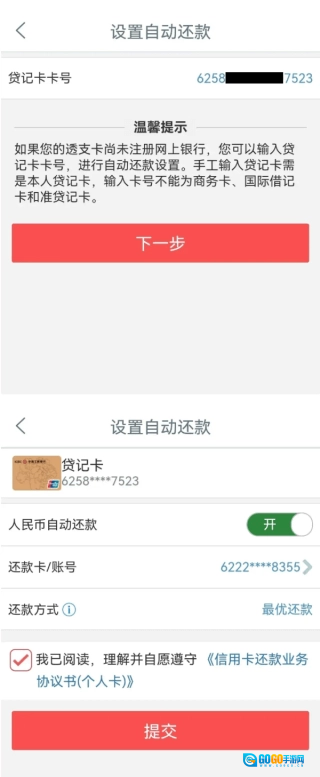若您的卡片尚未开通自动还款功能,可点击“戳我添加新的自动还款卡号”,输入卡号后点击“下一步”,接着选择用于还款的卡片以及还款方式,在阅读并同意《信用卡还款业务协议书(个人卡)》后,点击“提交”按钮,就能完成自动还款的开通操作。