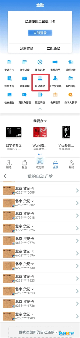 打开工银e生活App,进入“金融”页面后点击“自动还款”选项,就能看到已经开通自动还款功能的信用卡了。