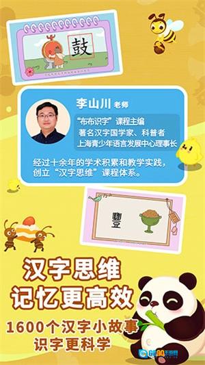 《布布识字》运用“汉字思维”体系展开教学。它借助神话故事导入汉字、展示字根,再由字根延伸出常用字,进而用常用字组合成语汇,让孩子在生动的故事场景中掌握汉字,逐步培育其“汉字思维”能力。