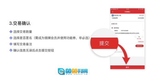 在“交易确认”页面,先选定交易数量,再选择是否匿名,接着填写交易备注,确认所有信息准确无误后,点击提交按钮即可。