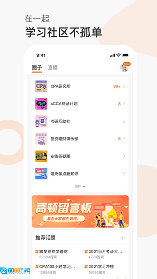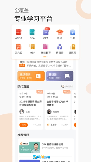 高顿网校是一款专注于财会培训的专业直播学习软件,它整合了财经金融领域20余种证书课程、在线题库、实时直播、考试动态、考友互动、专业答疑等多元功能,课程覆盖范围广泛,既包含国内与国际财会证书培训、金融证书培训,也涵盖职业能力提升类课程,同时提供一站式备考指导与考试资讯服务,助力用户实现财经领域的职业理想。另外,软件还具备离线学习功能,用户可将课程视频下载至手机,不受时间地点限制随时观看;学习结束后,还有丰富的题库资源可供练习,帮助巩固所学知识。总而言之,高顿网校是财会人员备考学习的得力助手,有需求的用户不妨前来体验一番!