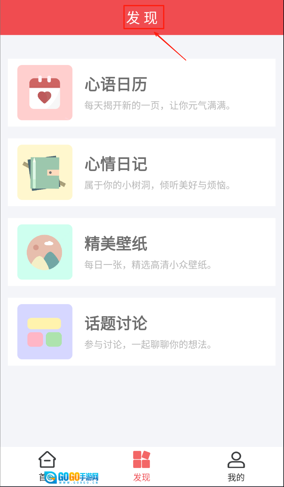 进入发现页面,借助心语日历获取每日箴言;通过心情日记,记录生活中的点滴瞬间;还能在精美壁纸板块更换手机桌面,提升视觉体验。