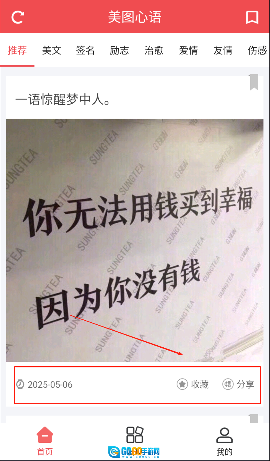 在浏览推荐、励志等分类的图文内容时,可点击右下角的收藏图标来构建个人素材库;若遇到优质内容,能通过分享按钮转发给好友;底部的导航栏则支持随时切换至不同的功能模块。