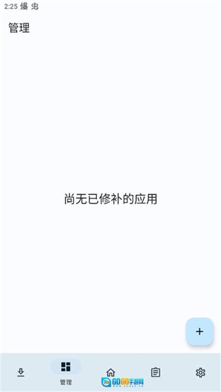 打开LSPatch应用,点击底部导航栏的第二个“管理”选项,然后找到右下角的加号图标。