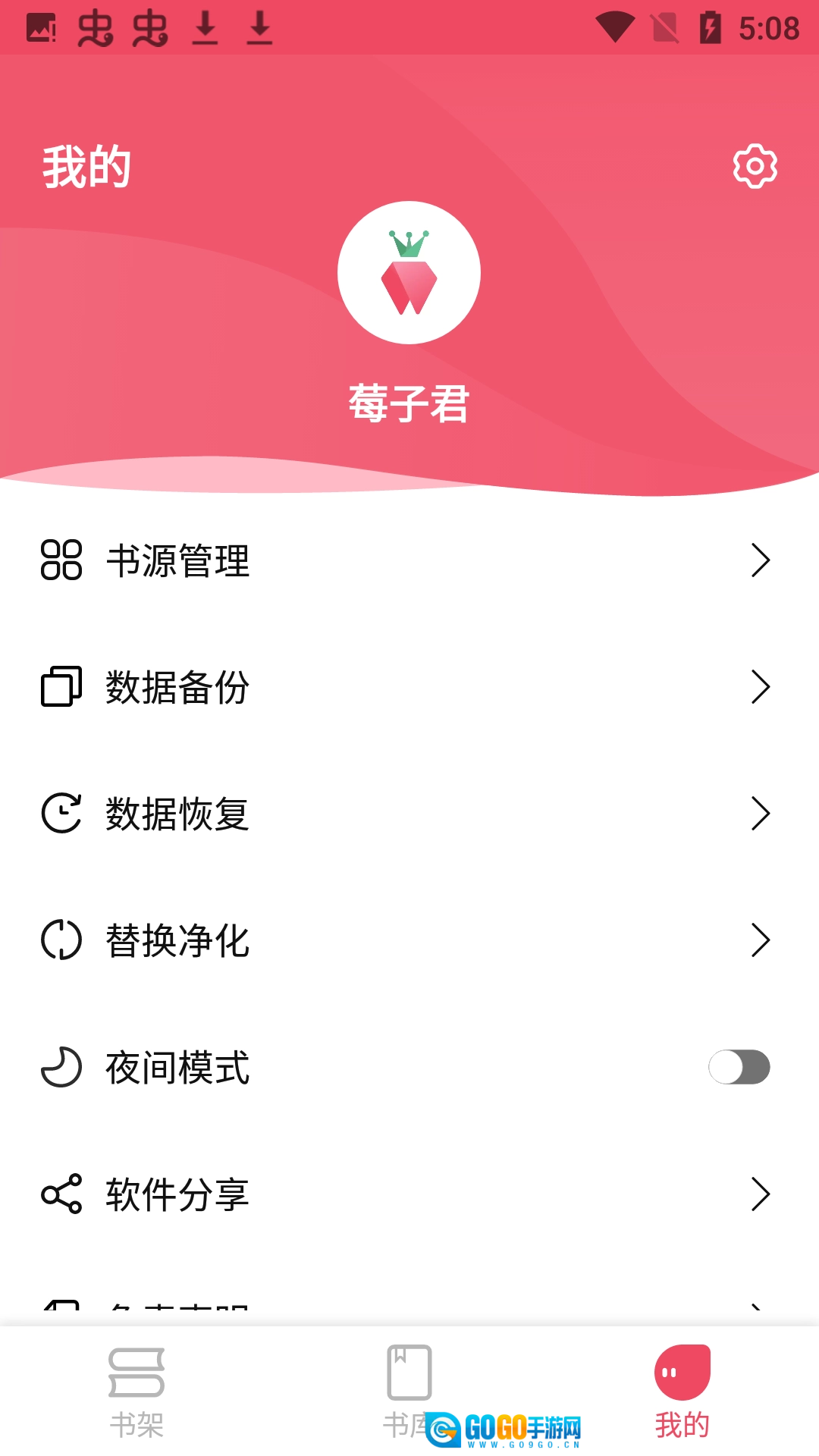 在我的页面中,你能够对书源进行管理,还可以备份数据、恢复数据,设置替换净化规则,以及开启夜间模式等功能。