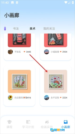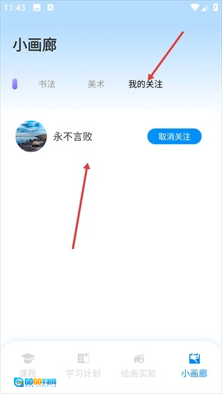 回到小画廊页面,点击切换到“我的关注”标签,就能看到刚刚关注的作者了。