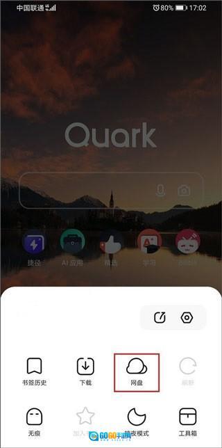 打开夸克浏览器后,点击菜单图标,进入夸克网盘;