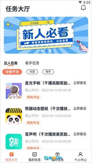 推推侠是一个通过推广短视频获取奖励的平台。用户能够实时承接推广任务以赚取收益,完成的任务数量越多,所获收益也就越高。每个任务的奖励各不相同,且都标注得十分清晰,用户可依据自身需求领取任务。此外,短视频作者也可以在此投稿,由平台协助进行推广。