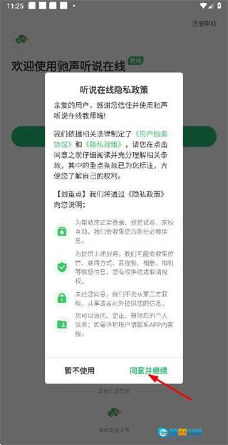 在使用协议与隐私政策弹窗里点击“同意并继续”按钮,即可进入登录页面。