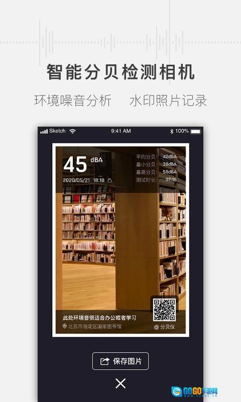 判断噪音状况的参考标准:可结合软件给出的分贝标准参考值和参考实例,来判断当前环境的噪音情况,比如是否适合办公学习、居家环境会不会影响休息等,还能利用定位功能记录不同地点的数据。