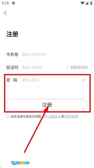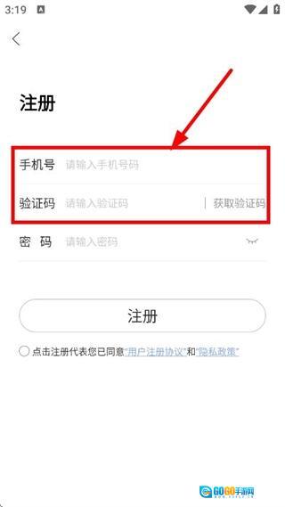 在注册页面,先输入手机号,接着点击“获取验证码”按钮,然后输入收到的验证码。