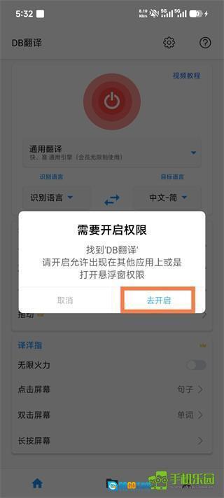 打开DB翻译应用程序,点击界面中间的启动按钮,之后系统会提示我们授予相关权限。