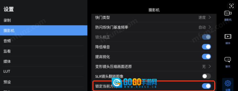 打开摄影机设置,将锁定当前方向开关开启即可。