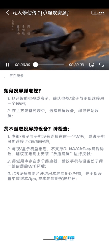 请注意,一定要保证手机和电视连接着同一个WiFi网络,不然就没办法搜索到投屏之后的内容。