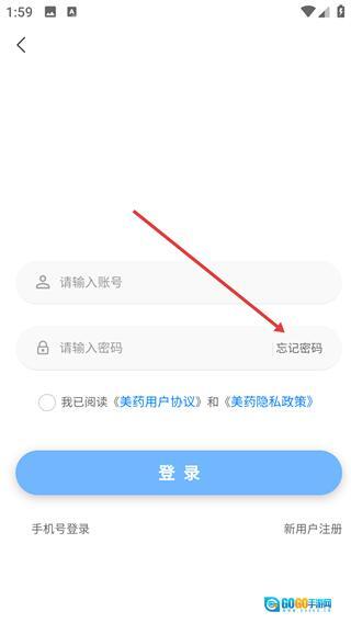 在美药应用的登录界面,要是忘记了密码,点击【忘记密码】按钮,就能进入身份验证的流程页面。