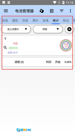 进入【电池管理器】页面后,切换至【统计】标签页,就能查看【唤醒】-【屏幕常亮】等与电池相关的各类统计信息。