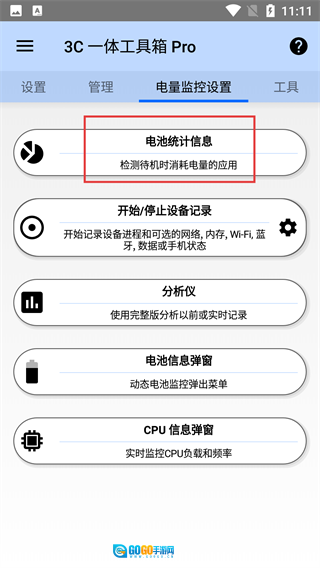 在【3C一体工具箱Pro】的【管理】标签页中,点击顶部的【电量监控设置】选项,即可进入对应的电量监控相关设置页面。