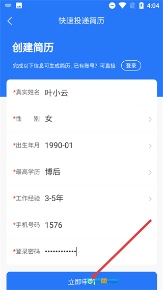 在【快速投递简历】的创建简历页面,把【真实姓名-性别】这些必填信息补充完整后,点击【立即申请】按钮,就能完成简历投递的操作啦。